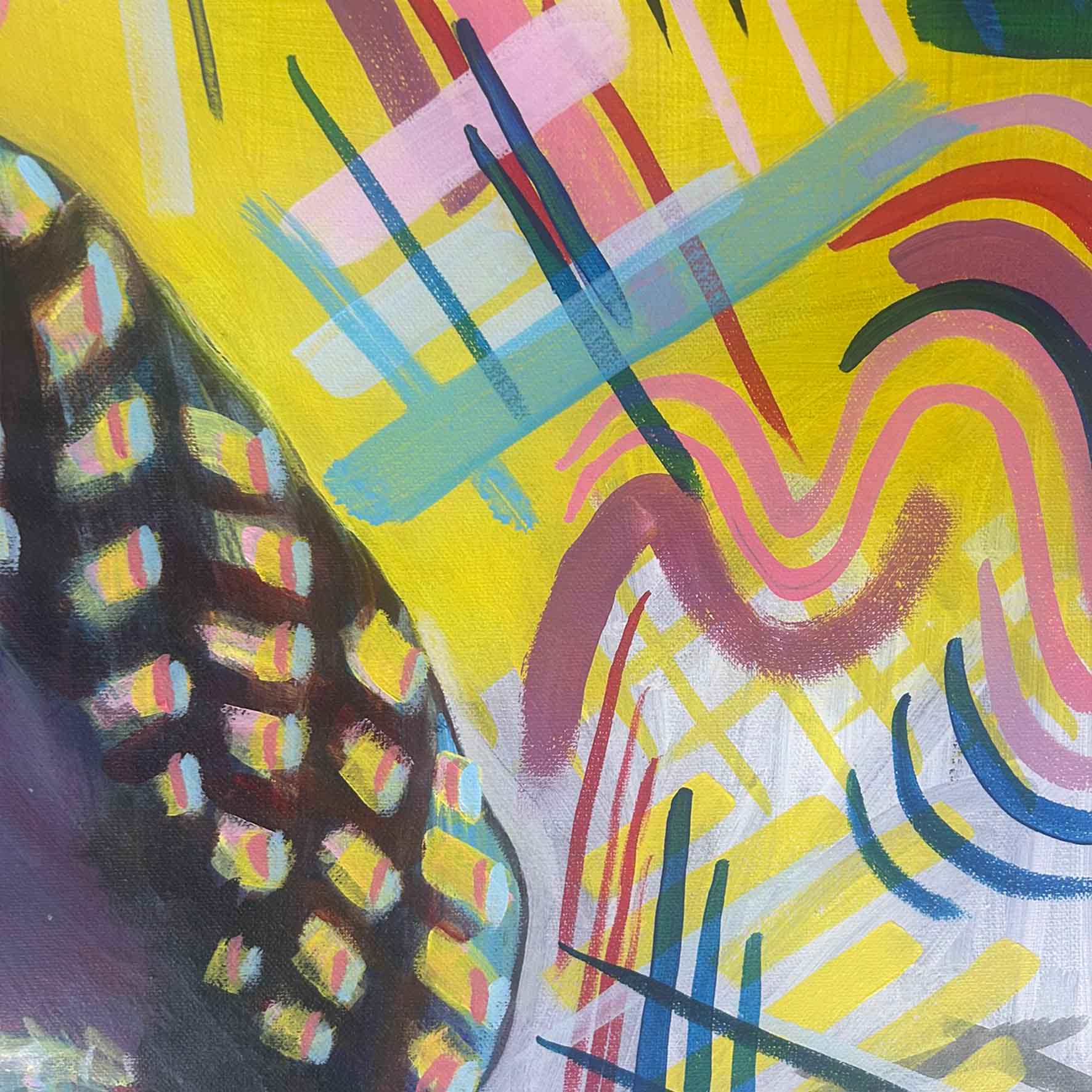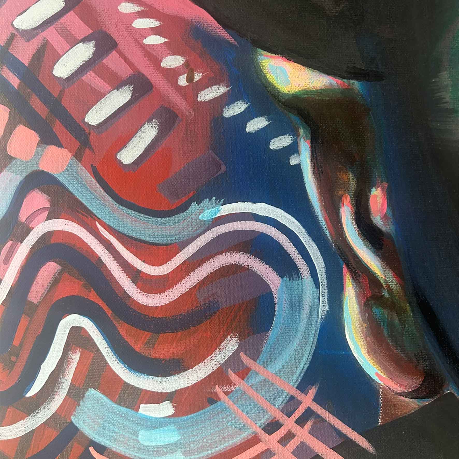 This third painting in Epitome of Five pushes the balance between stillness and energy. By bringing the face so close to the viewer, the portrait becomes confrontational yet contemplative, with the gaze holding a quiet intensity. I used layered colours and rhythmic marks to create a sense of internal movement, as if emotion were shifting beneath the surface. The background patterns act as echoes of thought or sensation, blurring the line between the subject’s presence and their surroundings. This piece explores how proximity changes perception, asking how much expression can exist within a moment of stillness. It became a study of emotional focus and the power of looking back at the viewer.