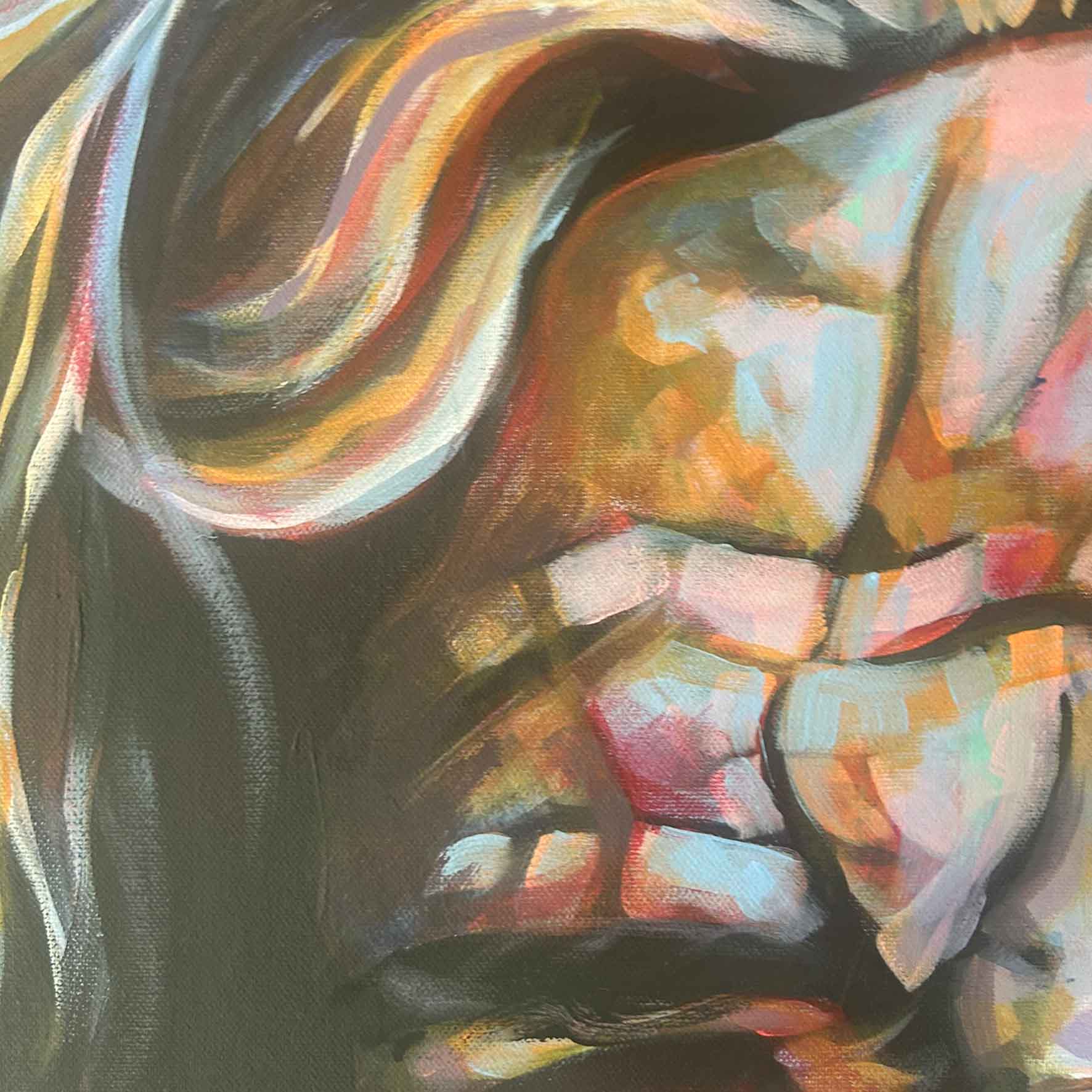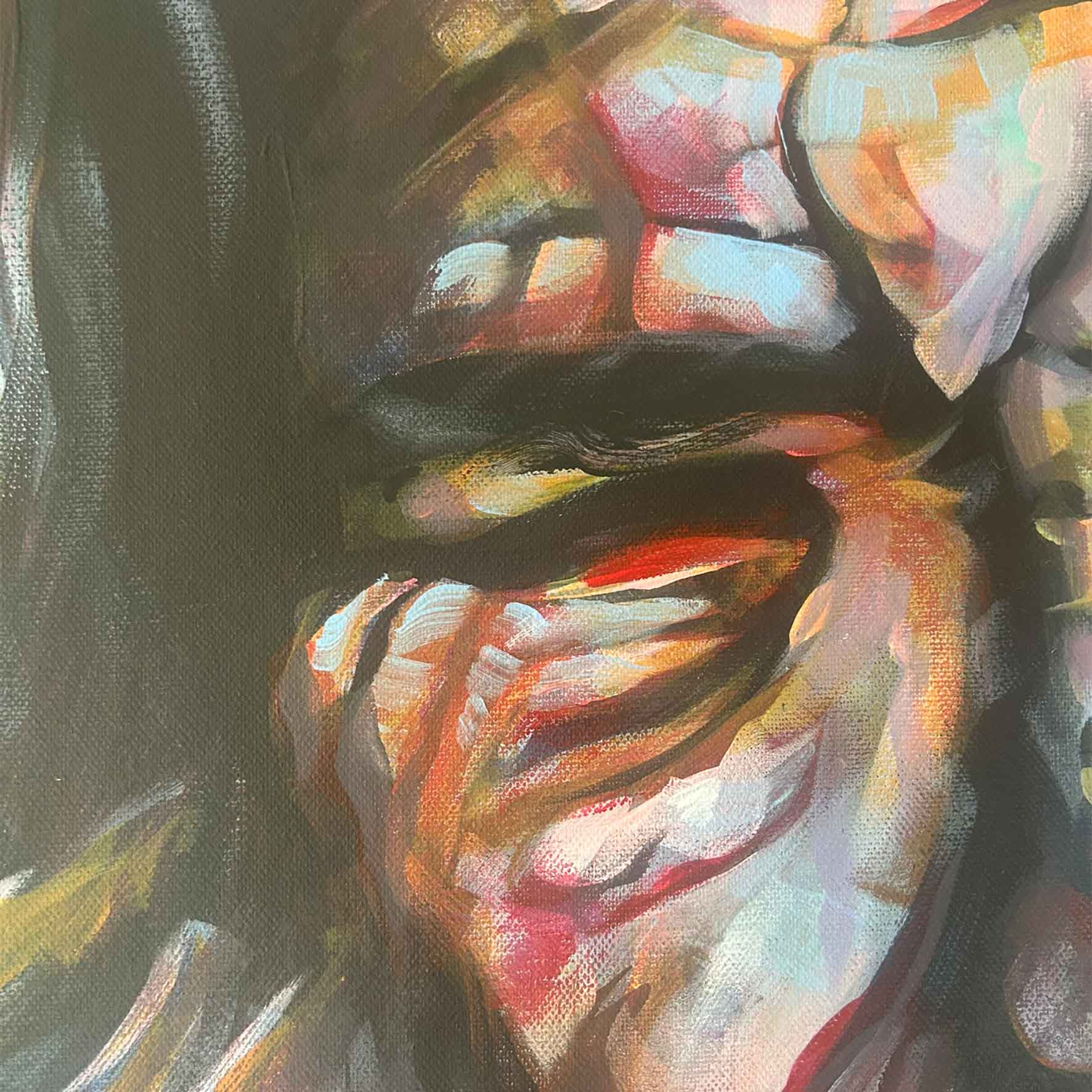 This fifth and final painting in Epitome of Five brings together the key elements explored throughout the series. I aimed to balance structure and abstraction, creating a portrait that felt both grounded and fluid. The detailed rendering of the face and hair contrasts with the looser treatment of the clothing, where brushwork and texture take precedence over form. This contrast allowed me to explore the tension between control and release, a theme that has run through the entire series. The colours and movement carry a sense of resolution, as if the painting itself is settling into stillness after a period of exploration. It felt like a fitting conclusion, uniting precision, expression, and intuition into one final statement.